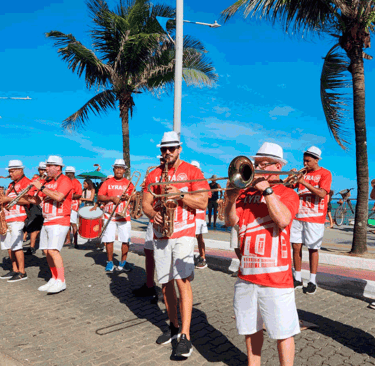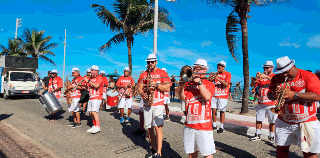 Abrindo a festa, a Charanga Lyra levou às ruas o clima das tradicionais marchinhas carnavalescas, resgatando memórias e aquecendo o público que acompanhava o cortejo pela orla e pela Avenida Atlântica. Com cores e muito entusiasmo, o grupo reforçou a tradição cultural presente na programação.